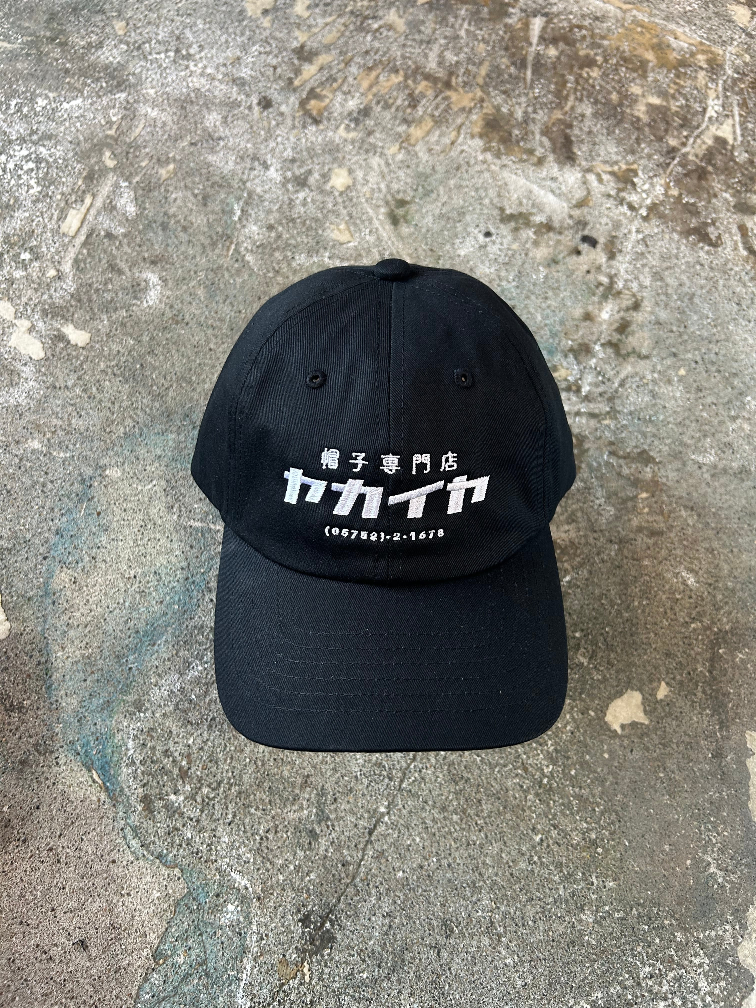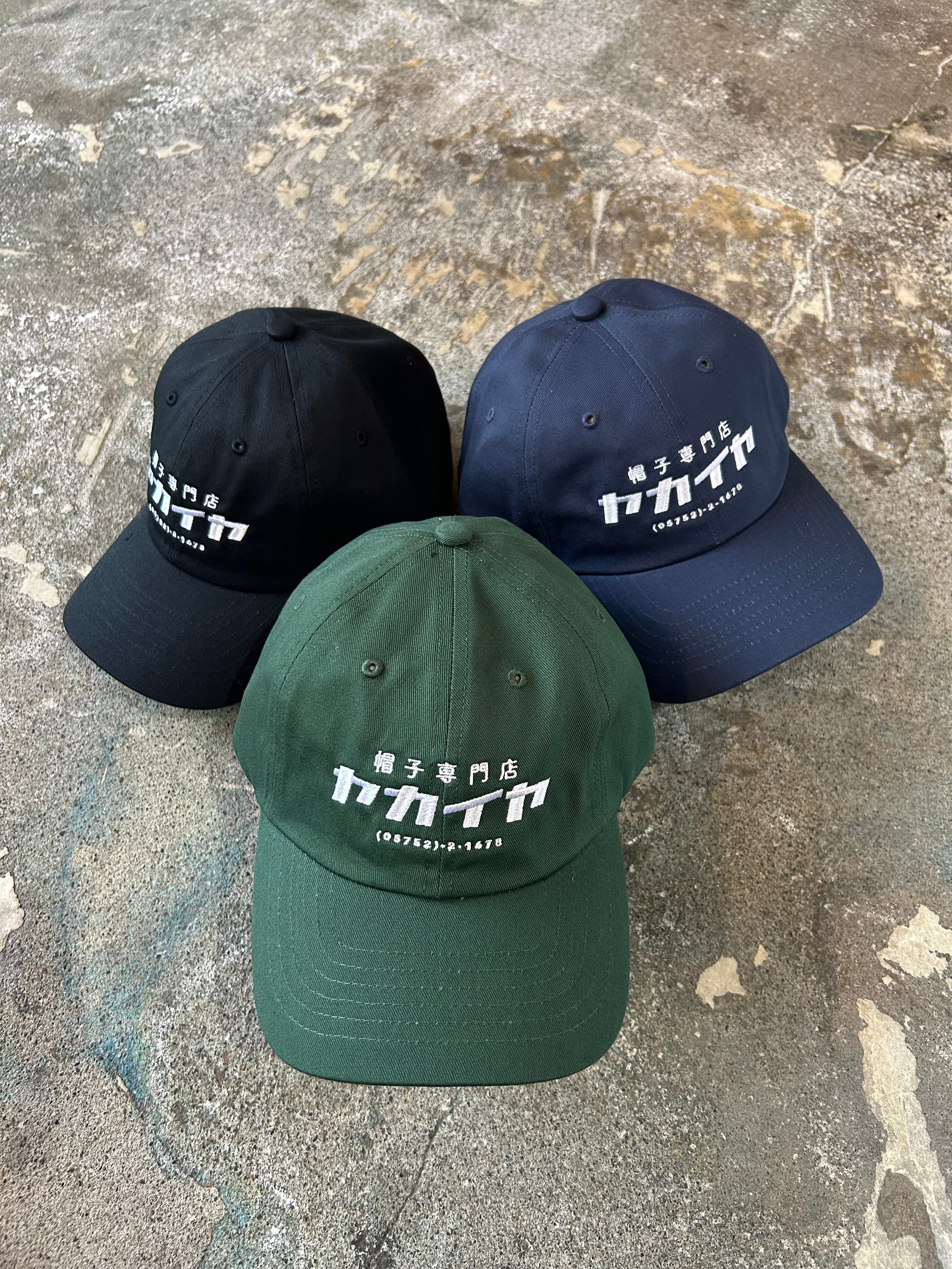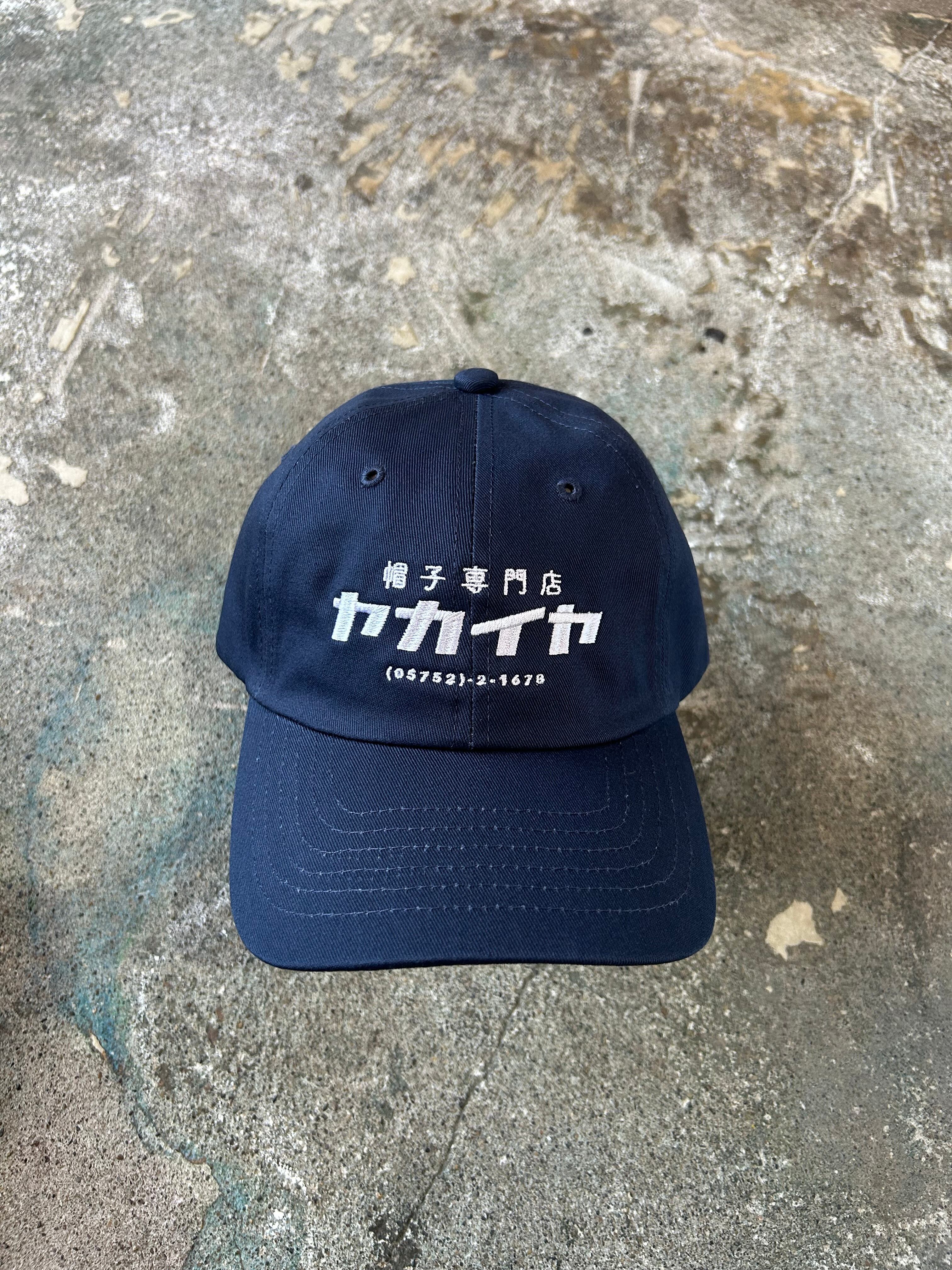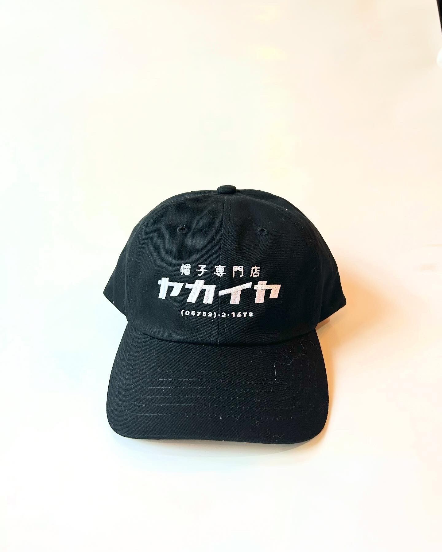 お店の名前「ヤカイヤ」、そして「帽子専門店」の文字と電話番号を刺繍した、実用性と存在感を兼ね備えたキャップ。
