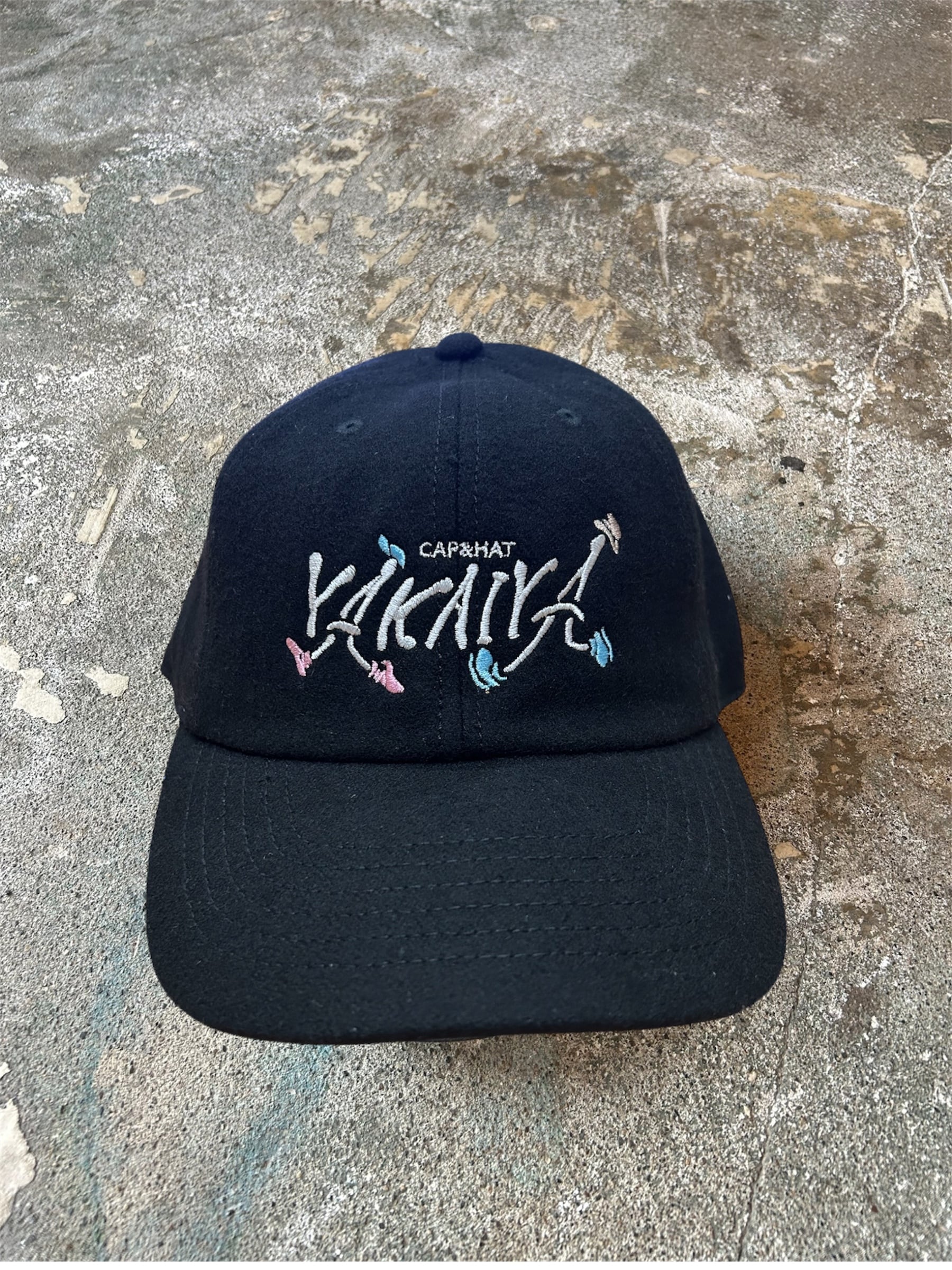 ウール生地の質感やヘリンボーンの生地に、ポップな刺繍を組み合わせたヤカイヤオリジナルキャップ。